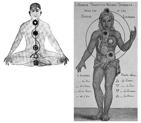Ilustración hindú de los siete chacras principales y, a título comparativo, ilustración de Johann Gichtel para los textos sobre los chacras del místico cristiano del siglo XVII Jakob Böhme.