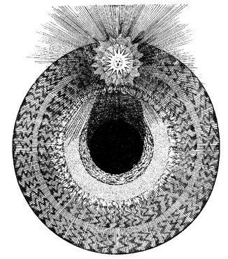 De nuevo, al ojo humano le hubiera parecido como si unas neblinas ligeramente mezcladas, que hubieran emanado primero de la mente divina, hubiesen sido absorbidas de repente por una segunda emanación. A continuación se produjo una violenta tormenta, un fenómeno extraño y espectacular como el que puede observar un astrónomo (la muerte de una estrella inmensa, quizá), aunque, en ese caso, «en el principio», debió de ser a una escala totalmente arrolladora, abarcando todo el universo.