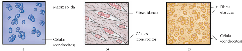 Figura 2.4.: Estructura del cartílago; a) cartílago hialino; b) cartílago blanco; c) cartílago elástico amarillo.