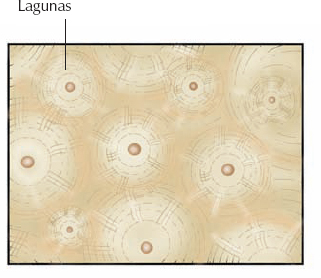 Las células óseas asientan en cavidades denominadas lagunas rodeadas de capas circulares de una matriz muy dura que contiene sales de calcio y mayores cantidades de fibras de colágeno.
