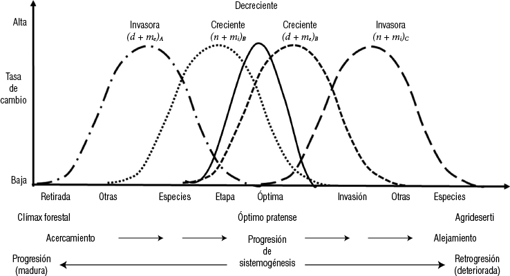 Las praderas sucesionales son biocenosis intermedias que se desarrollan luego que las poblaciones que constituyen las etapas serales anteriores se autoeliminan y con anterioridad al establecimiento de las poblaciones que invaden y, finalmente, reemplazan a aquellas características de las praderas (Figura 1-4). En ella puede observarse que las poblaciones características de la etapa pratense colonizan y se establecen, presentando tasas de natalidad e inmigración inicialmente altas (), pero ellas decrecen a medida que la interferencia intraespecífica aumenta. Luego y con posterioridad, la tasa de natalidad se incrementa debido a la mayor densidad y, por consiguiente, competencia. Ello es la causa de la invasión de especies características de etapas serales más avanzadas, las que finalmente terminan por dominar el bioma pratense.
