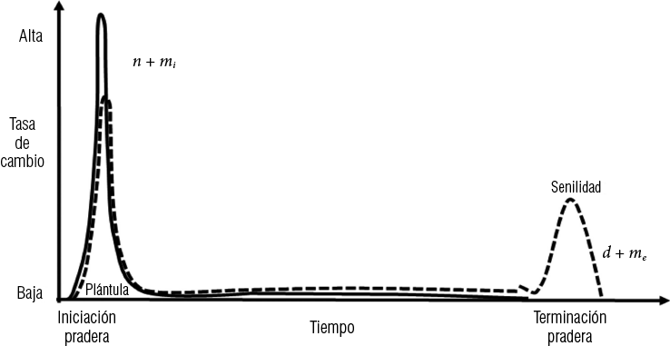 La Figura 1-5 presenta un esquema hipotético de la variación de la densidad de las plantas útiles en cultiseres prístinas con aporte adicional de disemínulas y sin reproducción vegetativa posterior a la población aportada. En ella se observa que, al establecer la pradera, la tasa de natalidad y de inmigración es muy alta durante un período relativamente corto, el cual coincide con la germinación de gran número de semillas y la emergencia de las plántulas. Luego, esta línea desciende bruscamente, lo cual coincide con el agotamiento de las semillas potencialmente en condiciones de germinar, pues la reserva de ellas en el suelo es muy baja y el almacenamiento de semillas duras, mucho menor.