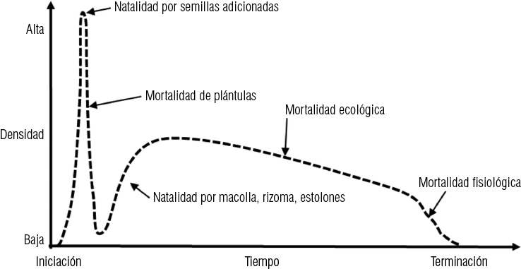 La variación de la densidad poblacional de plantas pratenses útiles en praderas cultiserales prístinas que presentan reproducción vegetativa con posterioridad al establecimiento de las plántulas aparece esquemáticamente representada en la Figura 1 6. En ella se resumen las causas de los aumentos debido a natalidad y las etapas características de la mortalidad ecológica y fisiológica.