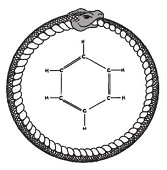 Volví mi butaca hacia el fuego y dormité. De nuevo los átomos estaban brincando ante mis ojos. Esta vez los grupos atómicos más pequeños se mantenían modestamente al fondo. El ojo de mi mente, agudizado por visiones de esta clase, podía distinguir ahora estructuras mayores de múltiples configuraciones: largas hileras algunas veces muy fuertemente unidas, enroscadas en una serpenteante imagen. Pero ¿qué era aquello? Una de las serpientes se había agarrado fuertemente de su propia cola y la figura que formaba giraba burlonamente ante mis ojos. Como cegado por el chispazo de un relámpago me desperté.(Kekulé citado en J. Gowan, 1974, pág. 83.)8