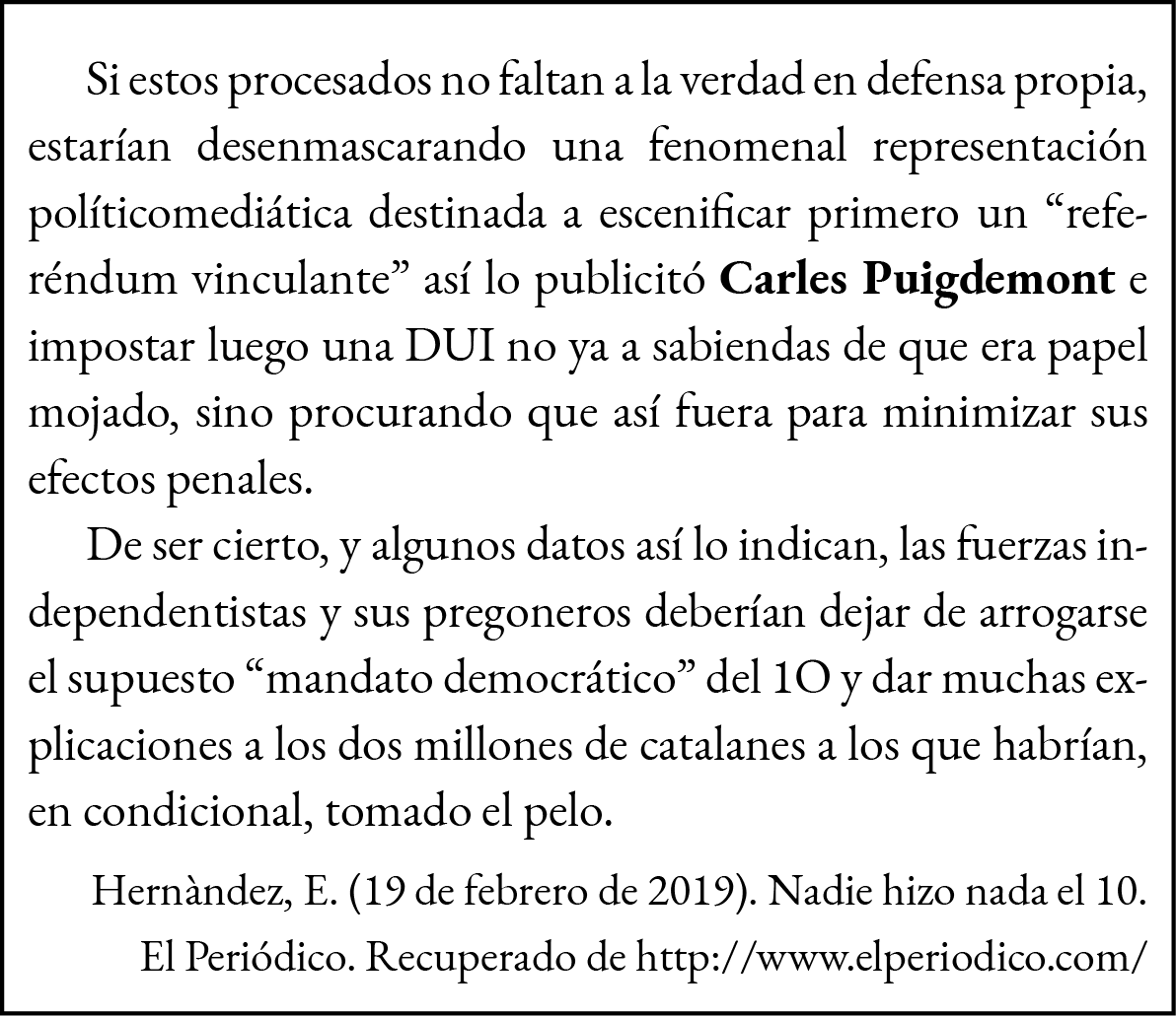 Ésa es la conocida hoja de ruta del independentismo: “tenemos que echar a la gente a la calle para crear las condiciones necesarias después del 10. No podrán meter a 2 millones de personas en la cárcel”. Es decir, el independentismo (y así está recogido no sólo en el sumario, sino en declaraciones públicas de sus líderes) usó las masas como muro de contención contra el Estado de Derecho.