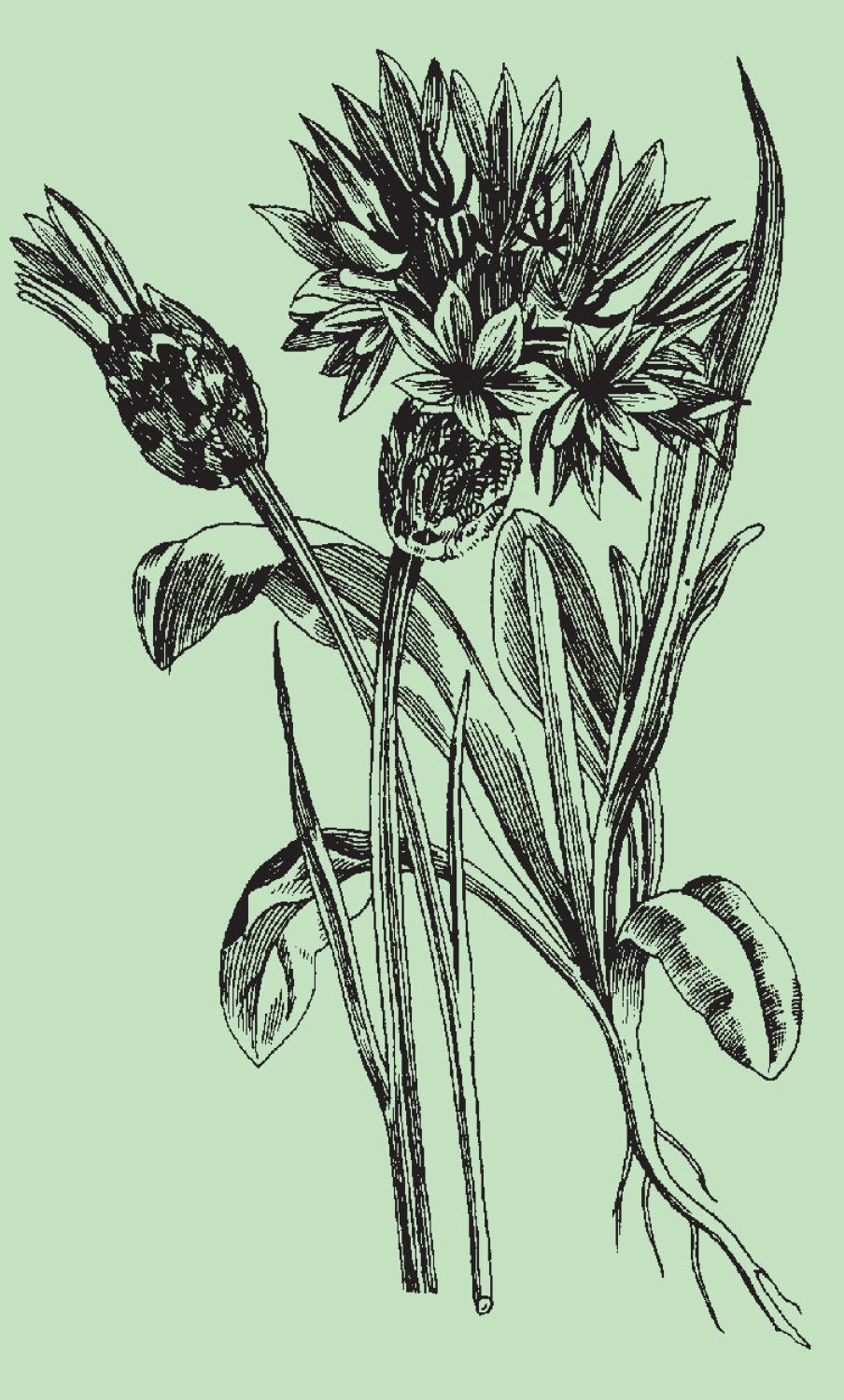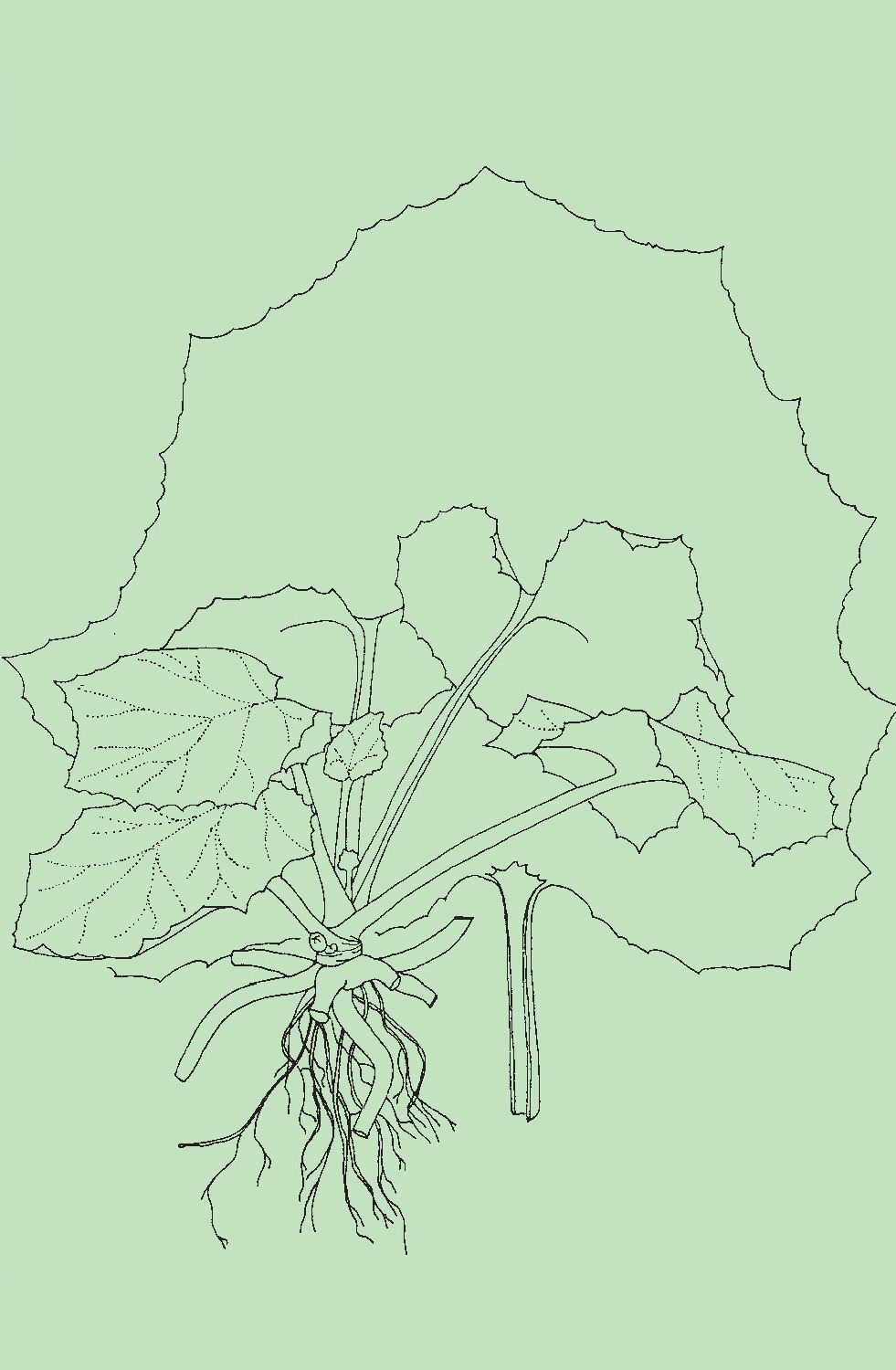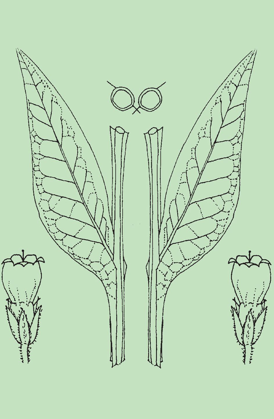 Hojas. Las basales son grandes, verde oscuras por arriba y glaucas por abajo, oblongas con la base sagital, enteras y abundantemente pecioladas. Las hojas que discurren a lo largo del tallo son gradualmente más pequeñas y las más altas se unen a él directamente, sin pecíolo (sésiles).