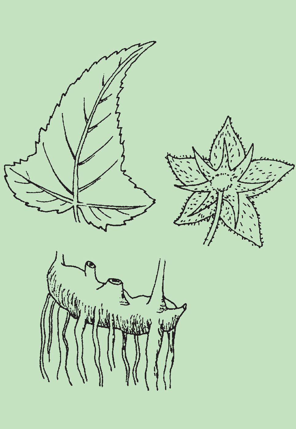 Hojas. Alternas, coriáceas, de color verde oscuro, ásperas y pilosas. La lámina es cordiforme en la base y presenta 3 lóbulos, gruesamente dentados y en ocasiones muy incisos; los pecíolos miden hasta 10 cm de largo.