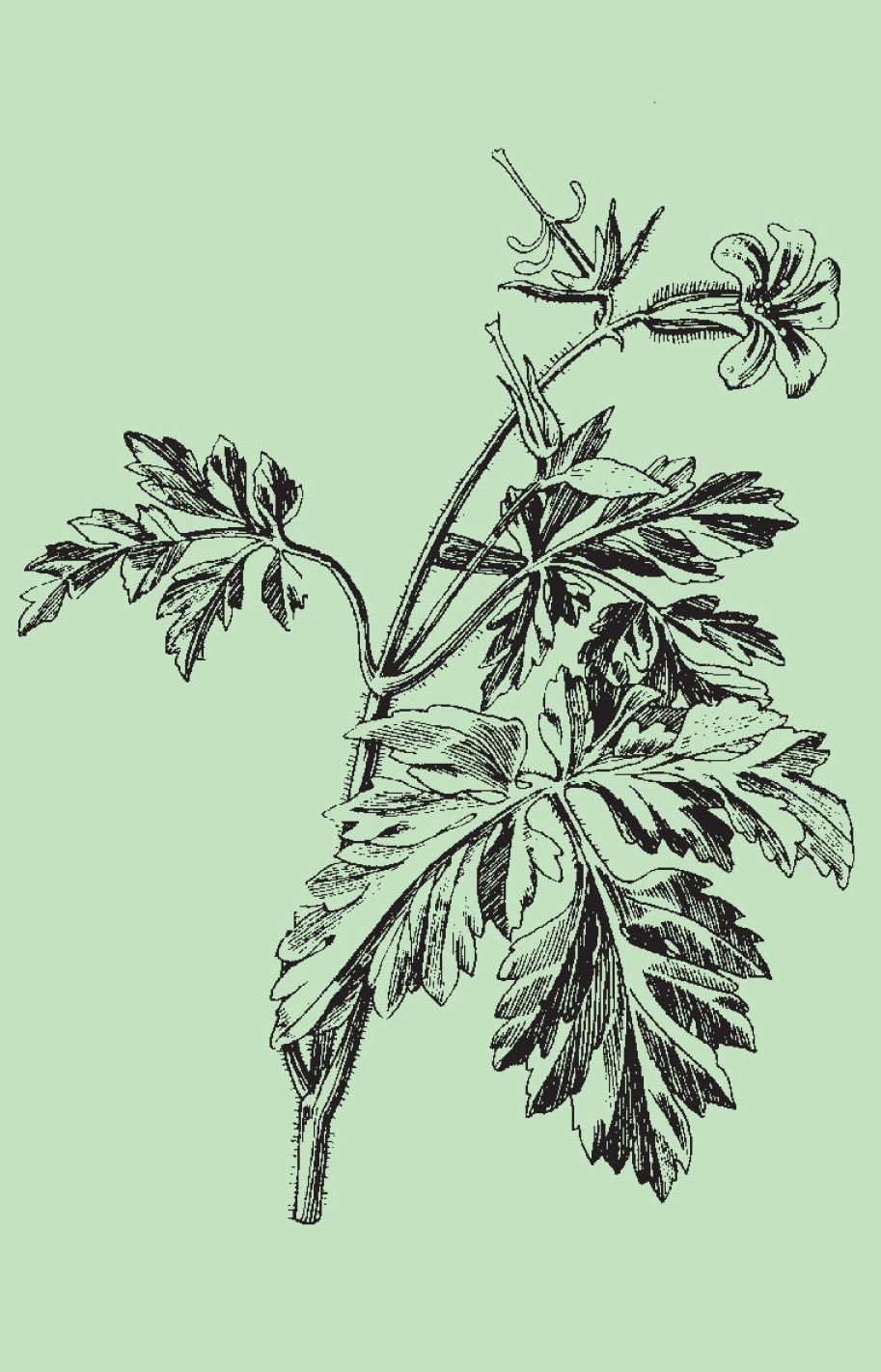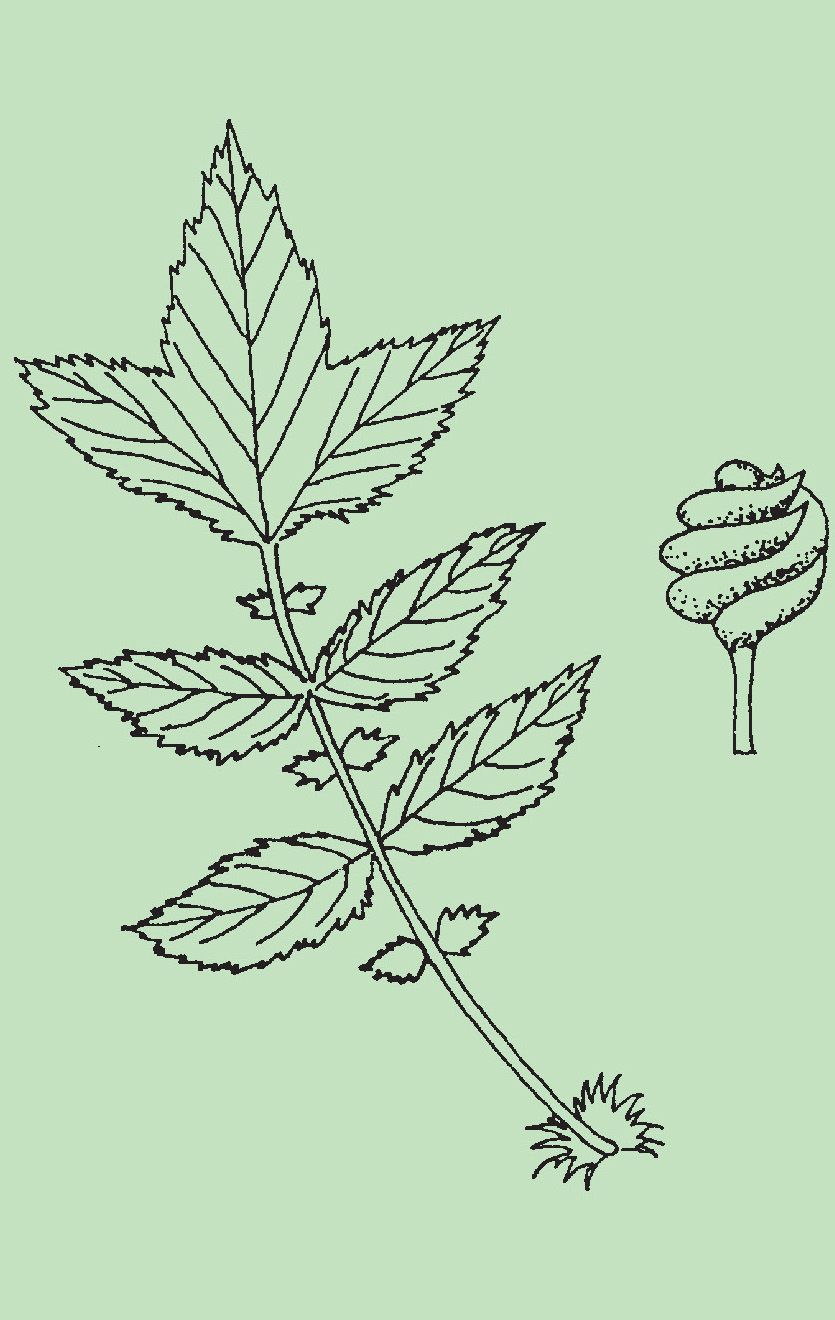 Hojas. Opuestas, de color verde claro, con largo pecíolo las inferiores y más largo aún las otras, compuestas (palmatisectas), con 3-5 segmentos lobulados.