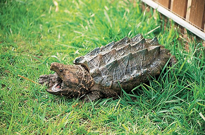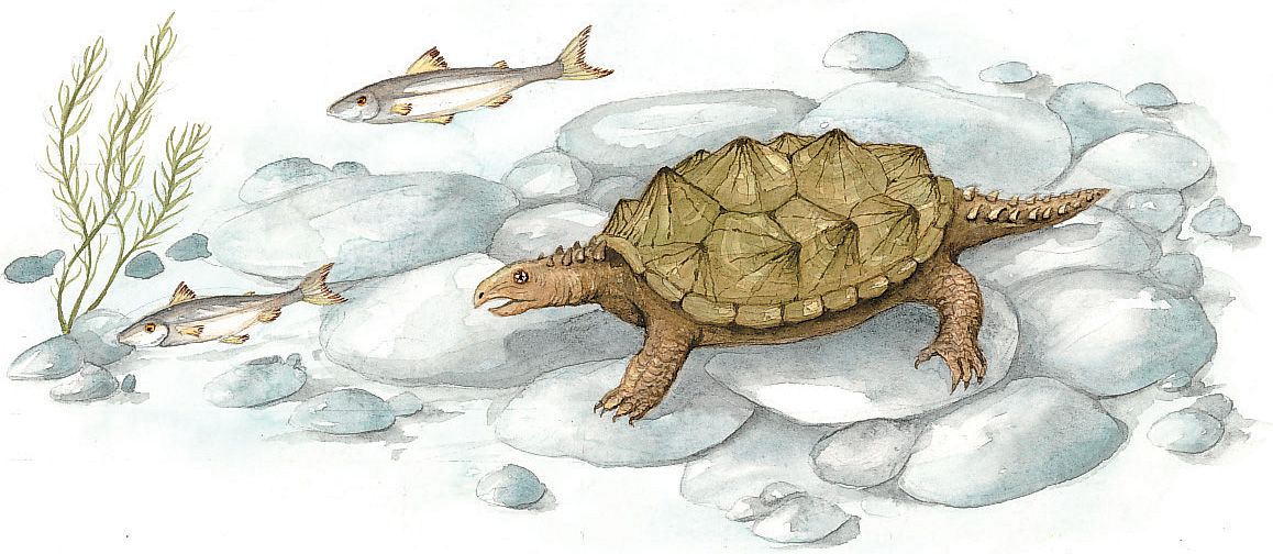 Supuesto aspecto de una Proganochelys quenstedti: el pico es menos pronunciado y los tubérculos del cuello son más evidentes que en la tortuga caimán (Macroclemys temminckii, en la fotografía)