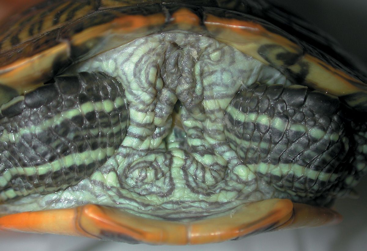 Trachemys scripta elegans (del suborden de los criptodiros) con la cabeza totalmente escondida dentro del caparazón