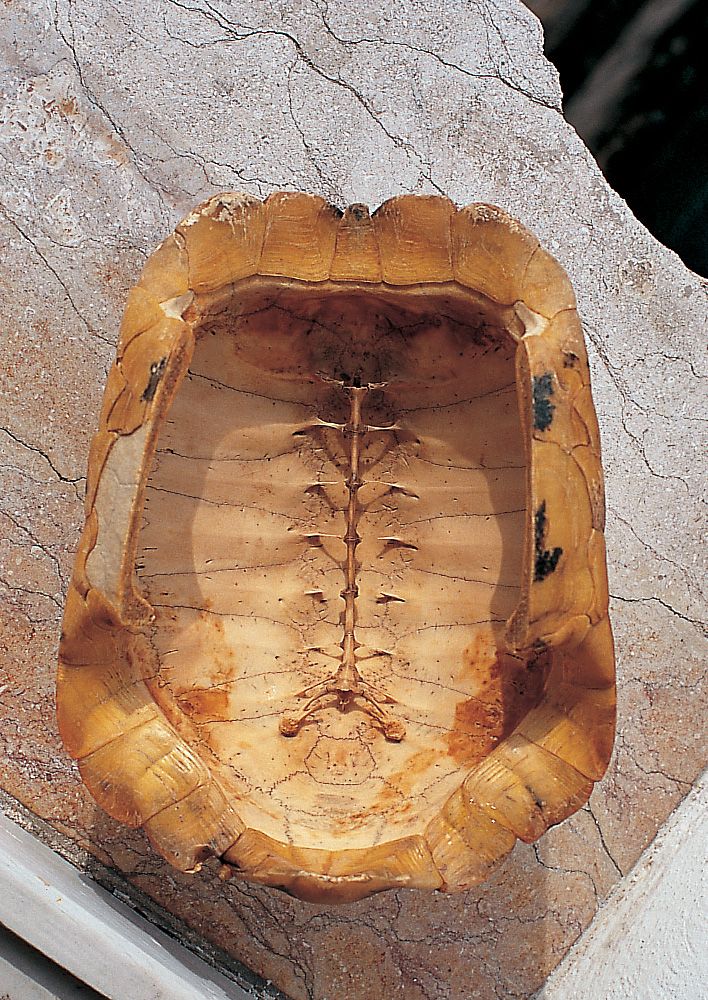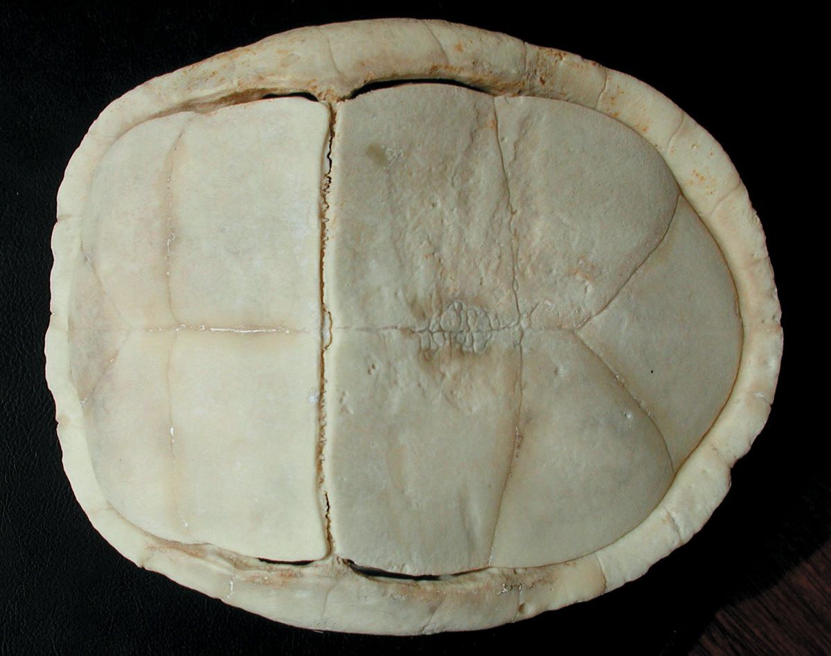 Esqueleto del plastrón de Cuora: resulta visible la articulación central que permite cerrar el caparazón