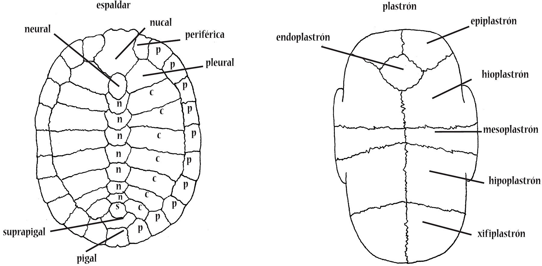 Las placas del plastrón se agrupan en seis pares. De delante hacia atrás se conocen como gulares, humerales, pectorales, abdominales, femorales y anales; la pequeña placa que hay junto a la base de la extremidad anterior se denomina axilar, y la que se halla junto a la base de la extremidad posterior se conoce como placa inguinal.