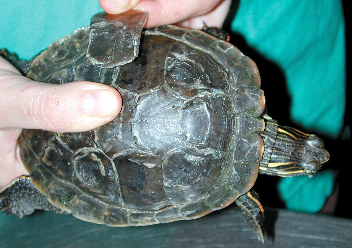 Espaldar, plastrón y puente óseo constituyen el caparazón de esta tortuga palustre