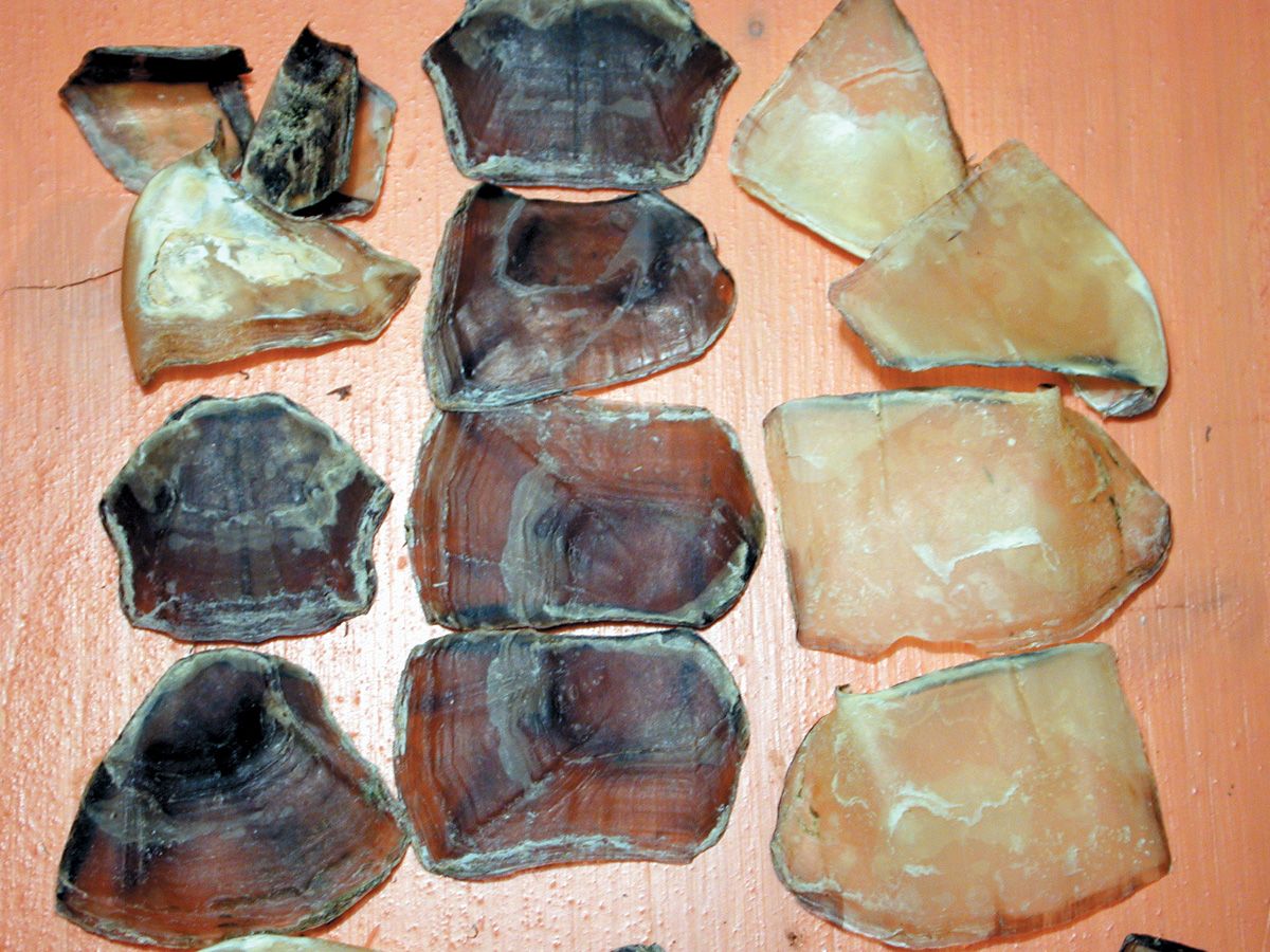 Cada una de las capas no representa necesariamente un año, sino un periodo de crecimiento (a veces de pocas semanas) seguido por un surco identificable con una fase en la que se ha detenido el crecimiento (letargo, estivación, enfermedad, etc.). Muchas especies acuáticas que pertenecen a los batagurinos o a los quélidos, al finalizar un periodo de crecimiento pierden los escudos internos porque son sustituidos por otros similares, que se han adherido bien a las placas óseas que hay debajo. En otras especies, en cambio, la caída de los escudos viejos tiene lugar por exfoliación, a trocitos muy pequeños.