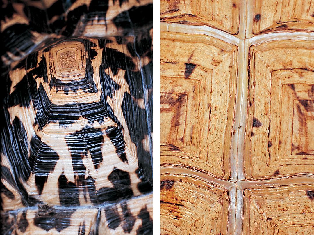 A la izquierda: La areola, es decir, la parte original de la placa existente desde el nacimiento, adquiere con el tiempo una posición descentrada, porque el crecimiento no es homogéneo en todas las direcciones; A la derecha: Líneas de crecimiento del plastrón