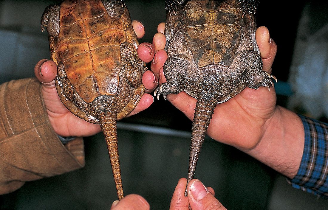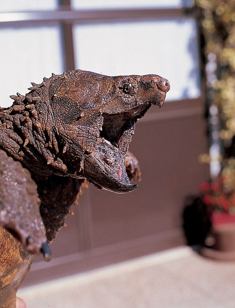 Macroclemys temminckii dotada, en la lengua, de un apéndice vermiforme y rojizo que es utilizado por la tortuga como cebo para atraer a las presas