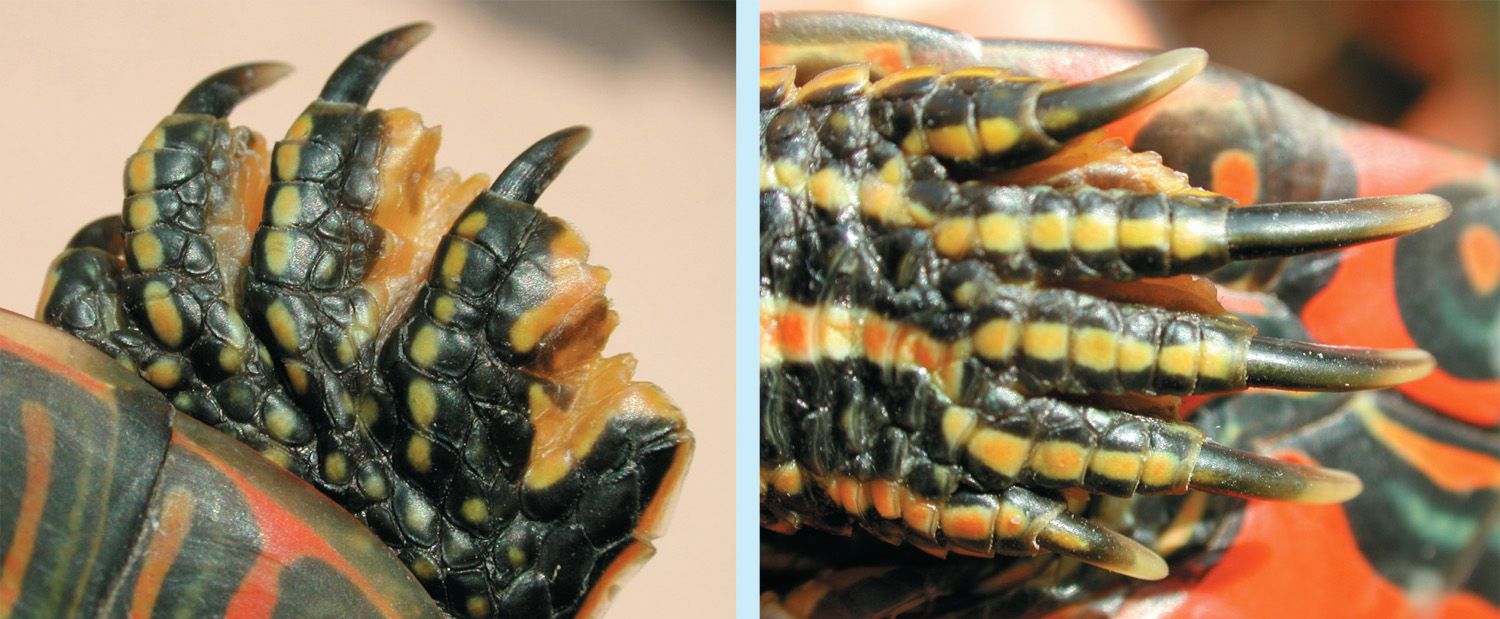 A la izquierda: Extremidad posterior de Chrysemys picta bellii (detalle de la membrana interdigital, utilizada para nadar); A la derecha: Extremidad delantera de Chrysemys picta bellii