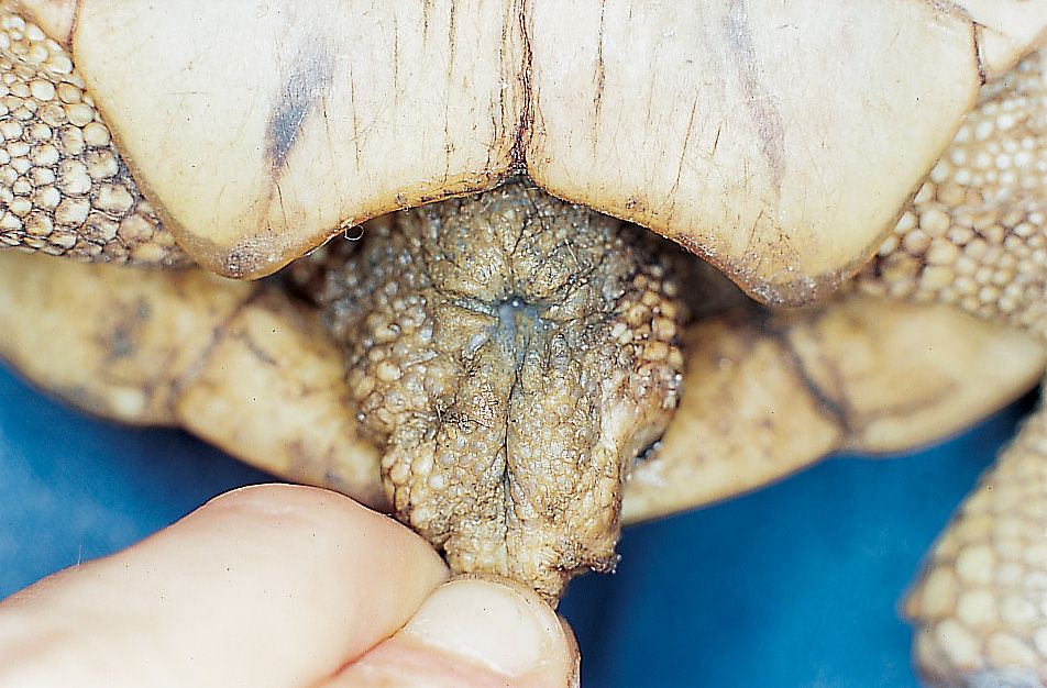 Cola. El macho adulto tiene, en general, una cola más gruesa y más larga, y la cloaca más alejada de la base de la cola. Esta característica tiene que ver con el apareamiento, ya que hace que al macho le sea más fácil introducir el pene en la cloaca de la hembra. Es una particularidad típica de gran parte de las especies de tortugas terrestres, aunque no es muy notable en Terrapene spp. ni en G. chilensis.