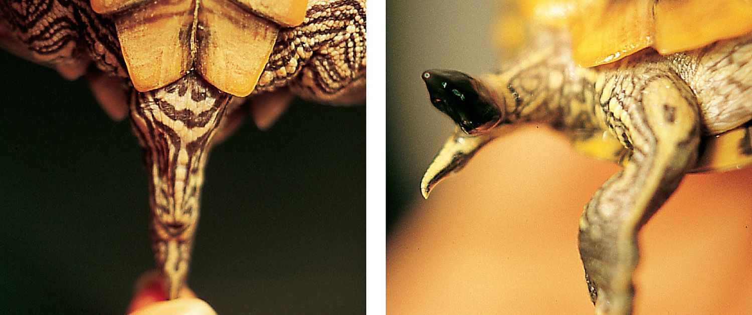 — el extremo del hocico con los orificios particularmente alargados, formando una pequeña trompa (trioníquidos, caretoquélidos y tortuga mata mata) o un cuello muy largo (muchos quelídidos y pelomedúsidos), que permite a la tortuga, en aguas bajas, permanecer en el fondo y respirar alargándolo;