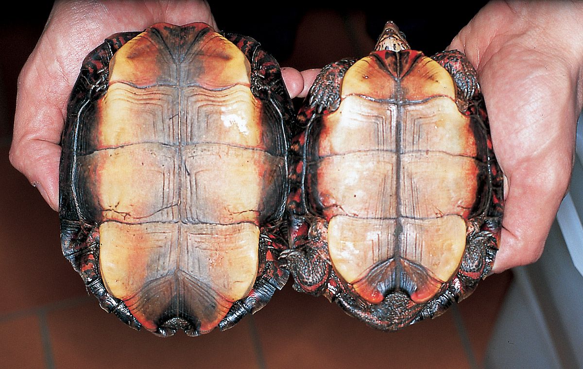 Plastrón. En algunas especies el plastrón de los machos se presenta más cóncavo que el de las hembras, que es casi plano; esta particularidad permite al macho adaptarse mejor a la forma convexa del espaldar de la hembra durante el apareamiento. En las hembras, el plastrón plano (característica particularmente evidente en Geochelone carbonaria) permite tener más espacio disponible para que se desarrollen los huevos.