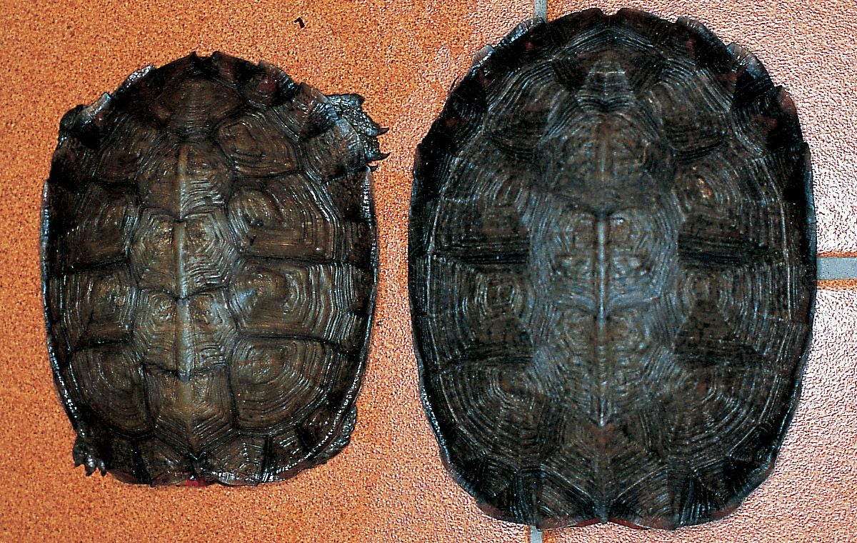 Espaldar. Las hembras de algunas especies suelen poseer un espaldar ligeramente más convexo. A veces, como en el caso de G. carbonaria, la anchura del caparazón es mayor en la hembra que en el macho.