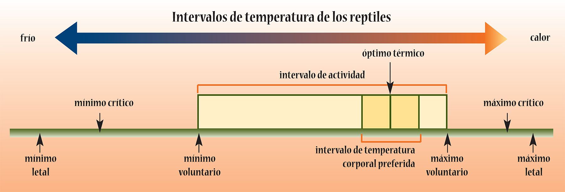 Los reptiles cambian la temperatura corporal durante los diferentes momentos del día y según el nivel de actividad, si bien muchos son capaces de mantener una temperatura bastante constante cuando están activos. Gran parte de los reptiles regulan de forma activa la propia temperatura corporal mediante el comportamiento: en este caso se habla de termorregulación conductual. El intervalo de temperatura ambiental en el que el reptil desarrolla las actividades regulares se denomina intervalo de actividad y comprende un mínimo y un máximo que varían según las especies. A ambos extremos de dicho intervalo se sitúan las temperaturas mínimas y máximas voluntarias, es decir, las temperaturas extremas a las que se expone el reptil voluntariamente; las temperaturas más bajas y más altas, a ser posible, son evitadas. Dentro de su intervalo de actividad, muchos reptiles presentan un intervalo más restringido denominado intervalo de temperatura corporal preferida.