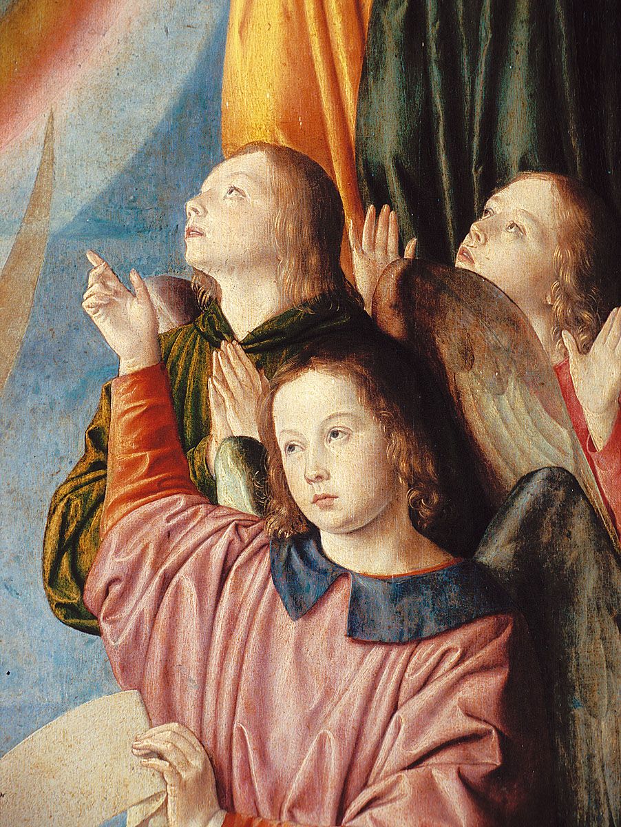 Ángeles adorantes, del Maestro de Moulins, 1502, detalle del tríptico de la catedral de Moulins