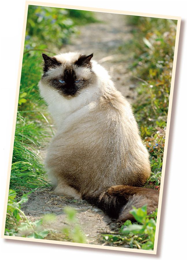 El sagrado de Birmania lleva siempre un motivo himalayo (colourpoint). Su manto es semilargo y requiere cuidados mínimos: basta con pasarle semanalmente un cepillo un poco duro (no el peine de metal, que puede dañar su delicado subpelo).