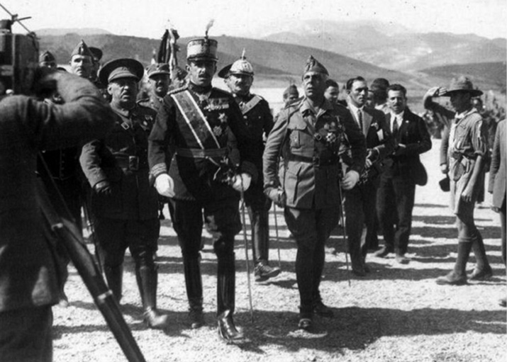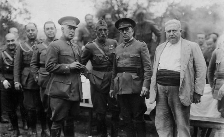El general Sanjurjo, fotografiado a la derecha del rey Alfonso XIII, junto a los generales Berenguer, Franco y Millán Astray durante la visita que el monarca realizó en 1928 al acuartelamiento de Dar Riffíen, en Ceuta.