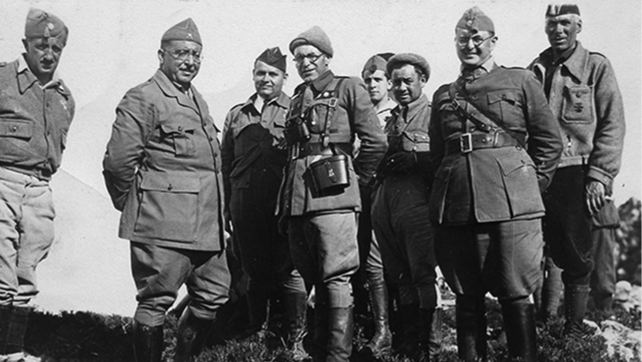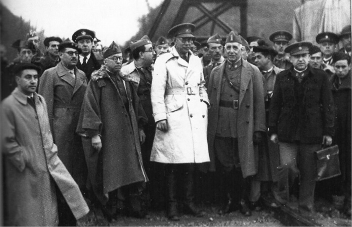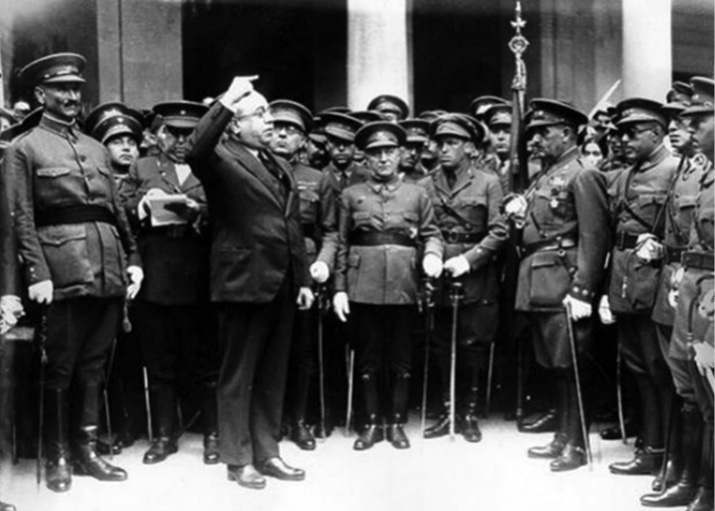 Manuel Azaña en 1931, cuando ejercía de ministro de Guerra, rodeado de varios oficiales. A la izquierda se encuentra Queipo de Llano, que no dudaría en alzarse contra él en 1936.