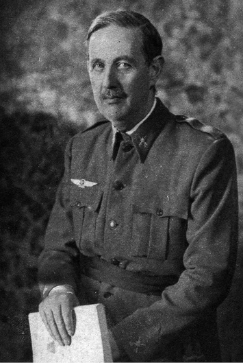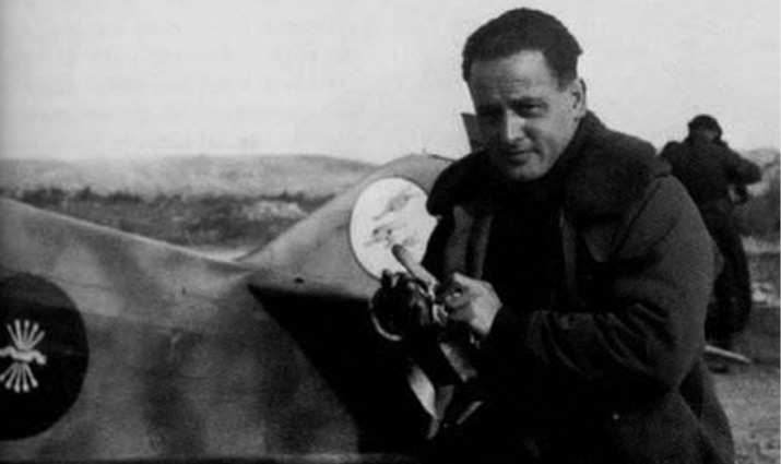 Joaquín García Morato ante un Fiat CR-32 de la Patrulla Azul, creada en diciembre de 1936 con los tres primeros aparatos que llegaron de Italia. García Morato nació en Melilla en 1909; tras pasar por la Academia de Infantería de Toledo y estar cinco años destinado en Marruecos, se convirtió en piloto militar en 1925. Era capitán cuando se unió en 1936 al golpe de Estado; participó en 511 misiones de combate y fue condecorado con la Cruz Laureada de San Fernando. Falleció el 4 de abril de 1939 al estrellarse su avión durante una exhibición aérea.