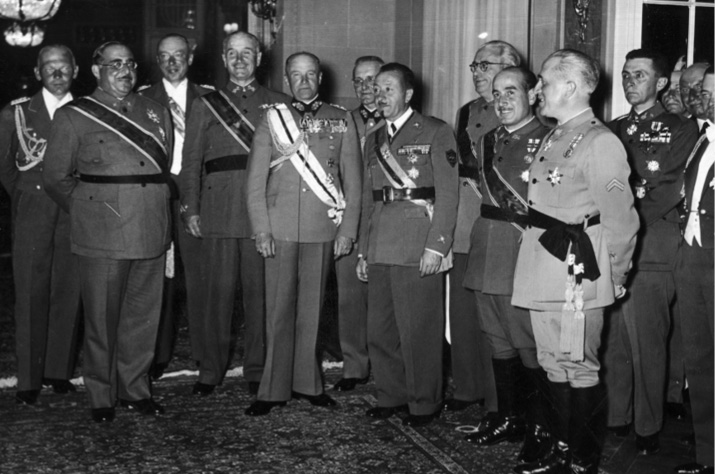 Generales españoles en Berlín el 7 de junio de 1939, tras el regreso de la Legión Cóndor a Alemania. Junto a Queipo de Llano, Yagüe, Aranda, Walther von Brauchitsch, general en jefe del Ejército, y Wolfram von Richthofen, general de la Luftwaffe.