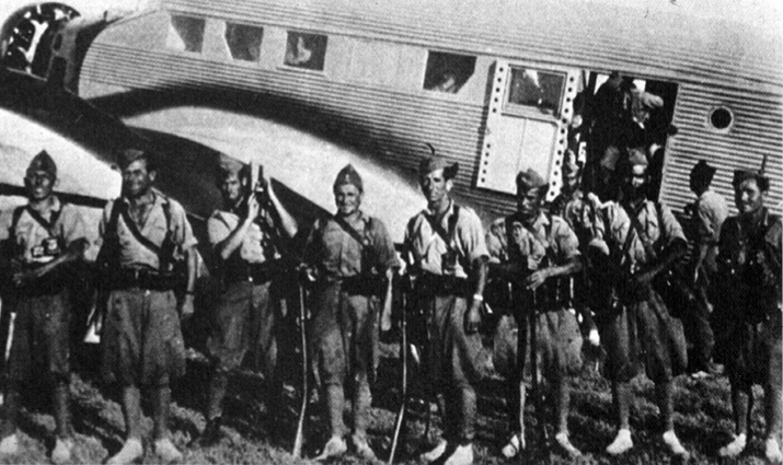 Legionarios trasladados desde Marruecos al aeropuerto de Tablada, Sevilla, en uno de los primeros Junker-52 aportados por la ayuda alemana.