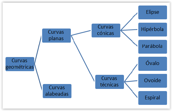 –Las curvas son figuras planas cerradas, que se clasifican en función de la manera de obtención de la misma. Así hemos visto que pueden existir las curvas cónicas, obtenidas por la sección de un plano a un cono de revolución, o las curvas técnicas, obtenidas como una construcción resultado de la suma de distintos arcos de circunferencia.