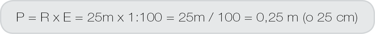 ∙Si tenemos que dibujar un segmento de 25 metros a escala 1:100, despejaríamos P de la fórmula para saber lo que debe medir en el plano, con lo que:
