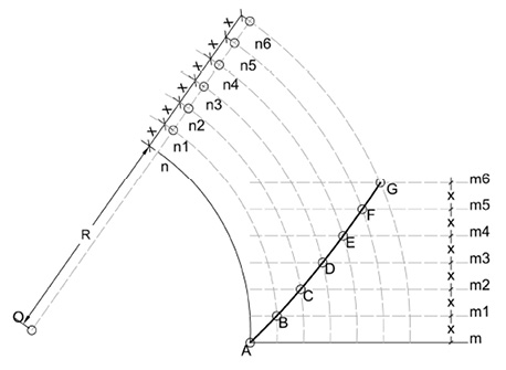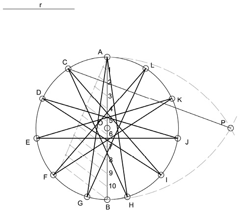 ∙El siguiente paso sería unir el punto P, con cada una de las divisiones de la escala 1:1. Con lo que obtendríamos las rectas P1, P2, P3 etc.