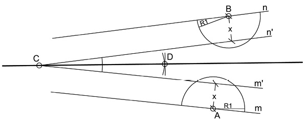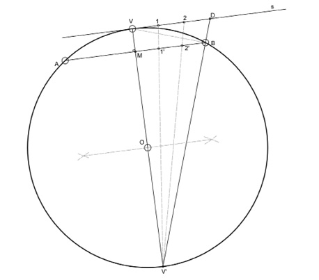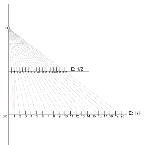 ∙En este punto, para obtener la escala, por ejemplo, 1:2, trazamos una línea vertical por la división número 1 de la escala natural, y marcamos el punto X donde este vertical se intersecta con la recta P2 que hemos trazado desde el punto P hasta la división 2 de la escala real.