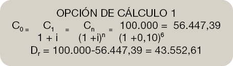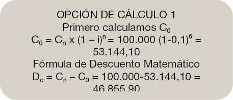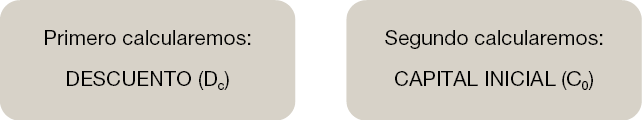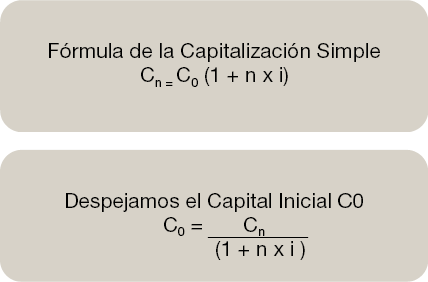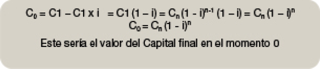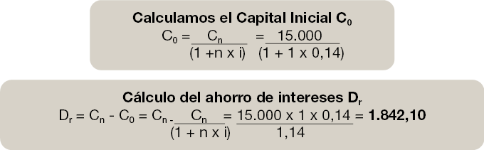 Cálculo del Capital Inicial C0 es la diferencia entre el Capital final (Cn) y el Descuento (Dc) que hemos calculado con la fórmula matemática anterior.