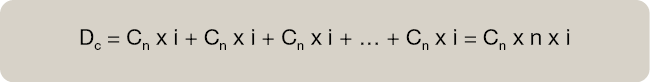 Cálculo del Descuento (Dc) suma de intereses que se van generando en los periodos de vamos adelantando, periodos descontados, que denominaremos (n) sobre el capital que vamos a descontar.