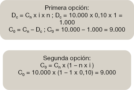 Una empresa con necesidades de liquidez acude a la entidad financiera para anticipar una deuda de su cliente por importe de 10.000 euros. El vencimiento de esta deuda es dentro de un año y la entidad financiera le ofrece un tanto de interés anual del 10%. Vamos a calcular el Capital inicial C0 y el descuento de la operación Dc.