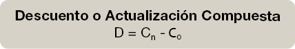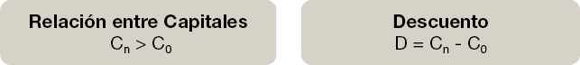 El Capital actual en el momento presente será C0 y siempre será inferior al Capital futuro Cn, es decir descontar el capital y traerlo al momento presente tiene un coste y es la diferencia entre C0 y Cn. Esta diferencia es lo que denominamos descuento D. Su expresión matemática sería: