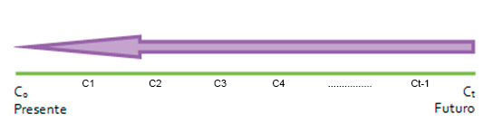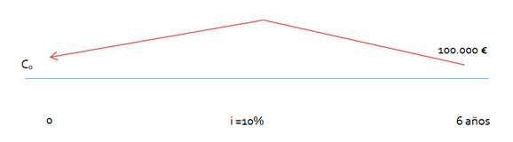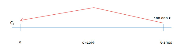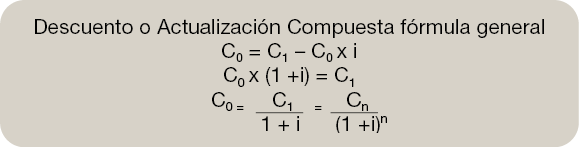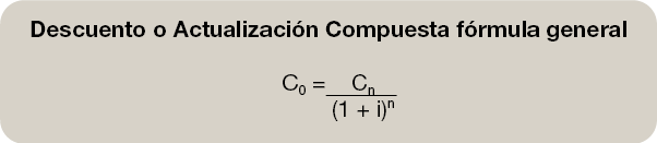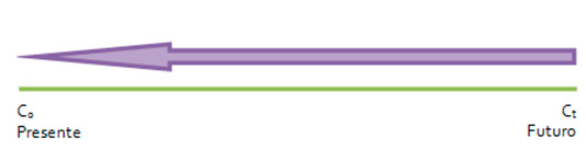 –Descontar o actualizar, partimos del capital en una fecha futura Ct y calculamos C0 que es el valor actual o presente que tendría Ct. Este cálculo nos permite conocer el valor del capital en un momento del futuro y situar su valor en el momento presente.