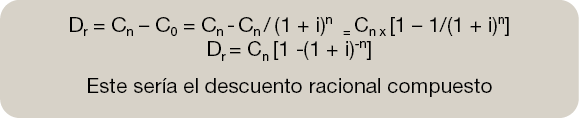 –El descuento racional compuesto es la cantidad vía intereses que se generan desde que se realiza el pago hasta el momento del vencimiento del capital.