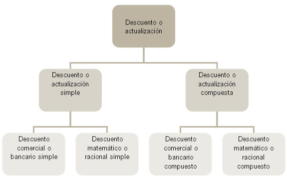 Partimos de la idea de que actualizar o descontar es la operación financiera contraria a la capitalización, consistente en calcular el valor de un capital futuro en el momento presente. Dentro de este tipo de operaciones financieras se encuentra el descuento comercial o bancario y el descuento matemático o racional.