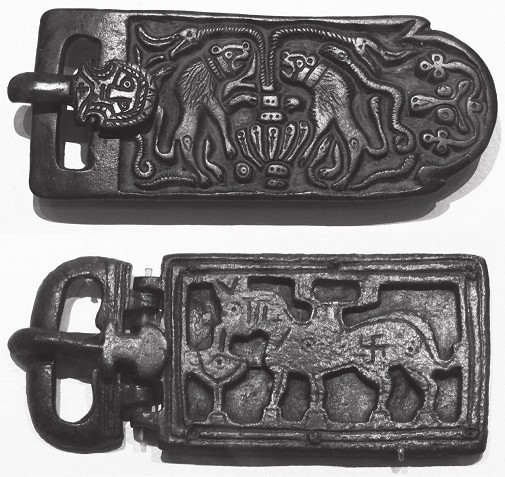 Fíbulas y placas visigodas en el Museo Arqueológico Nacional. Pese a que cuando invadieron Hispania los visigodos se habían convertido al arrianismo, en algunos objetos pueden rastrearse rasgos ornamentales paganos. Obsérvese la esvástica como símbolo solar sobre la grupa de un caballo en la imagen de abajo. Fotografías de Javier Arries.