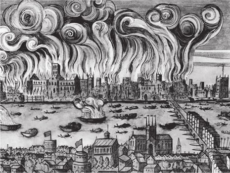 1666 es un año que ilustra otra característica de la Pequeña Edad de Hielo. El tiempo no solo fue más frío; los fenómenos climáticos también se hicieron más extremos y difícilmente predecibles. Al crudo invierno siguió una primavera desacostumbradamente cálida y escasa en lluvias y el verano la imitó. No solo padeció la agricultura; también se secó la madera de los techos y las vigas de los edificios (muchos de ellos de madera), de modo tal que bastó un pequeño fuego en una panadería de Pudding Lane para que, entre el 2 y el 5 de septiembre, ardiera todo Londres, una ciudad convertida en un mar de fuego. Durante el Great Fire of London, más de trece mil casas fueron pasto de las llamas y ochenta mil personas se quedaron sin techo.