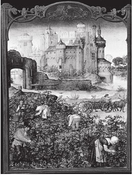 La vendimia (mes de septiembre), Brujas, taller de Simon Bening, hacia 1513-1515, extraído del Kalendarium Grimani. Venecia, Biblioteca de San Marcos. Foto: akg-images (AKG51 671).