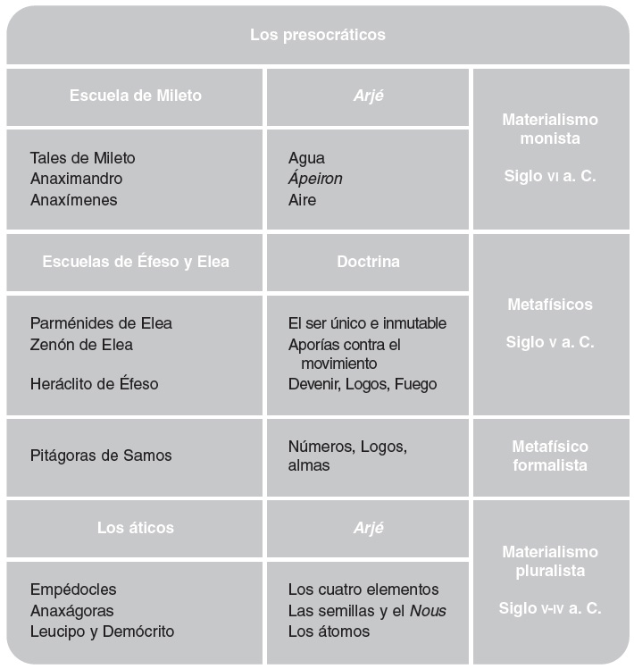 Llamamos presocráticos a los filósofos griegos anteriores a Sócrates, que anuncian y preparan la madurez del clasicismo griego. Los primeros viven en el siglo VI a. C., y los últimos son contemporáneos de Sócrates, en la segunda mitad del siglo V a. C. Toda su especulación gira en torno a la naturaleza (physis) y por eso Aristóteles les llama fisiólogos, físicos. La pregunta de los filósofos presocráticos es, desde Tales de Mileto, una pregunta por la physis, por la naturaleza de las cosas, por un principio último de la realidad que sea, al mismo tiempo, origen, causa y sustrato de todo lo real. Lo importante no será tanto su respuesta como la genialidad de formular tal pregunta en toda su amplitud y radicalidad. Otros pueblos orientales alcanzaron un elevado nivel de civilización antes que los griegos, pero sólo las categorías mentales de los filósofos presocráticos han hecho posible la ciencia y, en cierto sentido, la han engendrado. Admitir esto significa reconocer a los helenos una aportación excepcional a la historia de la cultura humana.