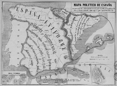 Mapa político de España en que se representa la división territorial con la clasificación política de todas las Provincias de la Monarquía, según el régimen especial dominante en ellas. Francisco Jorge Torres Villegas. Cartografía hispano-científica ó sea los mapas españoles en que se representa bajo sus diferentes fases. Imprenta de don José María Alonso, 1852. Collecció particular Josep Vicent Boira.
