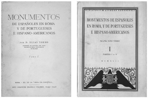 Portades del primer volum de l’original Monumentos de españoles en Roma..., en la seua edició de 1939 (esquerra) i de 1942 (dreta). Col·lecció particular Josep Vicent Boira.